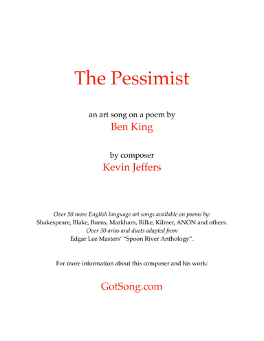 Medium Voice,Vocal Solo - Digital Download SKU: A0.1005449 Composed by Kevin Jeffers. Classical,Contemporary. 5 pages. Kevinjeffersvocalmusic #6274869. Published by kevinjeffersvocalmusic (A0.1005449). An art song on a poem by Ben Kingfor medium or high voicepiano/vocal score. This product was created by a member of ArrangeMe, Hal Leonard’s global self-publishing community of independent composers, arrangers, and songwriters. ArrangeMe allows for the publication of unique arrangements of both popular titles and original compositions from a wide variety of voices and backgrounds. About Digital Downloads Digital Downloads are downloadable sheet music files that can be viewed directly on your computer, tablet or mobile device. Once you download your digital sheet music, you can view and print it at home, school, or anywhere you want to make music, and you don’t have to be connected to the internet. Just purchase, download and play! PLEASE NOTE: Your Digital Download will have a watermark at the bottom of each page that will include your name, purchase date and number of copies purchased. You are only authorized to print the number of copies that you have purchased. You may not digitally distribute or print more copies than purchased for use (i.e., you may not print or digitally distribute individual copies to friends or students).