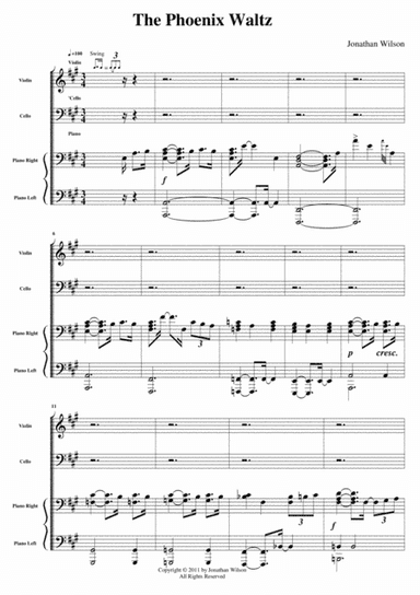Piano Trio,String Ensemble - Level 3 - Digital Download SKU: A0.1023021 Composed by Jonathan Wilson. Concert,Folk,Holiday,Jazz,Wedding. Score and parts. 26 pages. Fresh Air #4360871. Published by Fresh Air (A0.1023021). This is the piano trio arrangement of the Phoenix Waltz which was originally written to celebrate all of the musicians who played in the legendary Auchterby Band and the numerous musical line-ups born out of the ashes of that band. The Auchterby Band was a ceilidh band based in Aberdeen, Scotland which usually played fast and furious folky music for Scottish dancing at weddings, parties and various drunken events. The Phoenix Waltz is not actually particularly folky or Scottish in style (more like Jazz) but, nevertheless, works well as a last waltz of the evening. I arranged it for Piano, Violin and Cello for a fundraising concert to raise money for a new piano for our village hall and managed to rope in a couple of fantastic young musicians, through my piano teacher, to compensate for my mediocre piano playing. The piano, at that point, was borrowed and very out of tune, but the concert itself was totally unique and very special. I have included a recording from the concert which I hope you like. On listening to it I feel it is slightly rushed (I was nervous) so relax, take it easy and let it breathe! This product was created by a member of ArrangeMe, Hal Leonard's global self-publishing community of independent composers, arrangers, and songwriters. ArrangeMe allows for the publication of unique arrangements of popular titles and original compositions from a variety of voices and backgrounds. The length, difficulty, and retail pricing are determined solely by the discretion of the person who arranged or composed it. About Digital Downloads Digital Downloads are downloadable sheet music files that can be viewed directly on your computer, tablet or mobile device. Once you download your digital sheet music, you can view and print it at home, school, or anywhere you want to make music, and you don’t have to be connected to the internet. Just purchase, download and play! PLEASE NOTE: Your Digital Download will have a watermark at the bottom of each page that will include your name, purchase date and number of copies purchased. You are only authorized to print the number of copies that you have purchased. You may not digitally distribute or print more copies than purchased for use (i.e., you may not print or digitally distribute individual copies to friends or students).