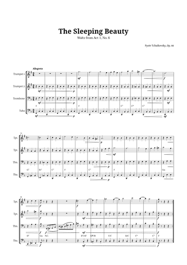 Brass Quartet - Level 1 - Digital Download SKU: A0.1247996 Composed by Peter Ilyich Tchaikovsky. Arranged by Langanho. 19th Century,Classical,Film/TV,Romantic Period,Wedding. 5 pages. Avery Lynn Jordan #842560. Published by Avery Lynn Jordan (A0.1247996). The sheet music of The Sleeping Beauty Waltz is a must-have for beginner musicians, teachers, and parents looking to provide an engaging musical experience. This simplified and condensed arrangement of Tchaikovsky's classic masterpiece perfectly caters to musicians who wish to play this beautiful piece. It is the ideal arrangement for music beginners, teachers in search of captivating repertoire, and parents who want to encourage their children to explore classical music. Its enchanting melody and the ballet context create a unique atmosphere, allowing each instrument to contribute its part to this musical story. Don't miss the opportunity to acquire this exceptional arrangement, the best in the market, and enjoy the beauty and emotion of The Sleeping Beauty Waltz in your Brass Quartet with Chords. This product was created by a member of ArrangeMe, Hal Leonard's global self-publishing community of independent composers, arrangers, and songwriters. ArrangeMe allows for the publication of unique arrangements of popular titles and original compositions from a variety of voices and backgrounds. The length, difficulty, and retail pricing are determined solely by the discretion of the person who arranged or composed it. About Digital Downloads Digital Downloads are downloadable sheet music files that can be viewed directly on your computer, tablet or mobile device. Once you download your digital sheet music, you can view and print it at home, school, or anywhere you want to make music, and you don’t have to be connected to the internet. Just purchase, download and play! PLEASE NOTE: Your Digital Download will have a watermark at the bottom of each page that will include your name, purchase date and number of copies purchased. You are only authorized to print the number of copies that you have purchased. You may not digitally distribute or print more copies than purchased for use (i.e., you may not print or digitally distribute individual copies to friends or students).