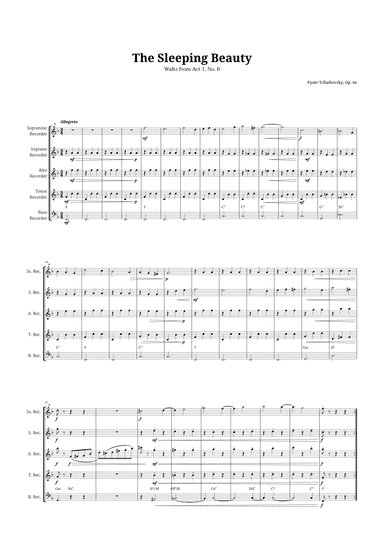 Recorder - Level 1 - Digital Download SKU: A0.1248112 Composed by Peter Ilyich Tchaikovsky. Arranged by Langanho. 19th Century,Classical,Film/TV,Romantic Period,Wedding. Recorder Ensemble. 6 pages. Avery Lynn Jordan #842675. Published by Avery Lynn Jordan (A0.1248112). The sheet music of The Sleeping Beauty Waltz is a must-have for beginner musicians, teachers, and parents looking to provide an engaging musical experience. This simplified and condensed arrangement of Tchaikovsky's classic masterpiece perfectly caters to musicians who wish to play this beautiful piece. It is the ideal arrangement for music beginners, teachers in search of captivating repertoire, and parents who want to encourage their children to explore classical music. Its enchanting melody and the ballet context create a unique atmosphere, allowing each instrument to contribute its part to this musical story. Don't miss the opportunity to acquire this exceptional arrangement, the best in the market, and enjoy the beauty and emotion of The Sleeping Beauty Waltz in your Recorder Quintet. This product was created by a member of ArrangeMe, Hal Leonard's global self-publishing community of independent composers, arrangers, and songwriters. ArrangeMe allows for the publication of unique arrangements of popular titles and original compositions from a variety of voices and backgrounds. The length, difficulty, and retail pricing are determined solely by the discretion of the person who arranged or composed it. About Digital Downloads Digital Downloads are downloadable sheet music files that can be viewed directly on your computer, tablet or mobile device. Once you download your digital sheet music, you can view and print it at home, school, or anywhere you want to make music, and you don’t have to be connected to the internet. Just purchase, download and play! PLEASE NOTE: Your Digital Download will have a watermark at the bottom of each page that will include your name, purchase date and number of copies purchased. You are only authorized to print the number of copies that you have purchased. You may not digitally distribute or print more copies than purchased for use (i.e., you may not print or digitally distribute individual copies to friends or students).