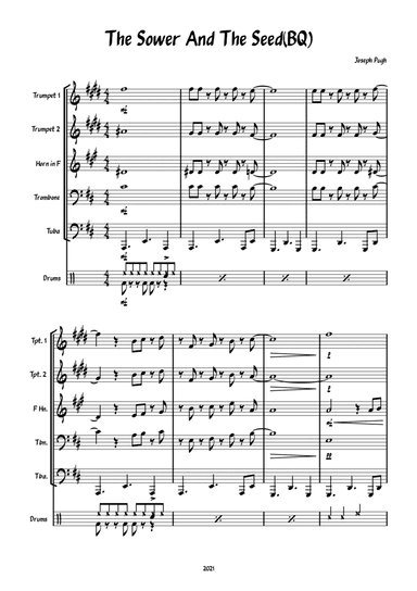 Brass Ensemble Horn,Trombone,Trumpet,Tuba - Level 3 - Digital Download SKU: A0.855294 Composed by Joseph Pugh. Christian,Jazz,Pop,Rock. Score and parts. 12 pages. Joseph Pugh #6537797. Published by Joseph Pugh (A0.855294). Original tune by , Joseph Pugh here arranged for BQ. This product was created by a member of ArrangeMe, Hal Leonard's global self-publishing community of independent composers, arrangers, and songwriters. ArrangeMe allows for the publication of unique arrangements of popular titles and original compositions from a variety of voices and backgrounds. The length, difficulty, and retail pricing are determined solely by the discretion of the person who arranged or composed it. About Digital Downloads Digital Downloads are downloadable sheet music files that can be viewed directly on your computer, tablet or mobile device. Once you download your digital sheet music, you can view and print it at home, school, or anywhere you want to make music, and you don’t have to be connected to the internet. Just purchase, download and play! PLEASE NOTE: Your Digital Download will have a watermark at the bottom of each page that will include your name, purchase date and number of copies purchased. You are only authorized to print the number of copies that you have purchased. You may not digitally distribute or print more copies than purchased for use (i.e., you may not print or digitally distribute individual copies to friends or students).