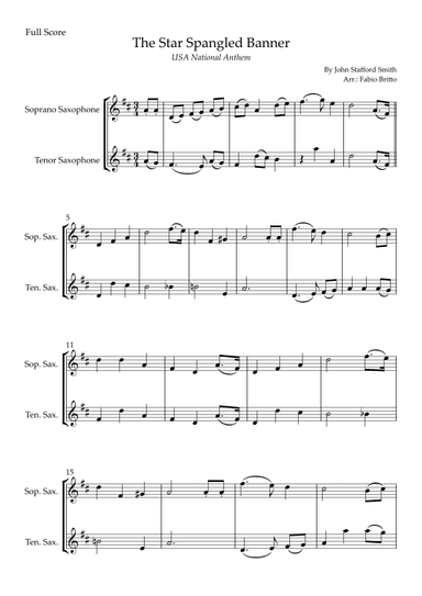 Instrumental Duet Instrumental Duet,Soprano Saxophone,Tenor Saxophone - Level 3 - Digital Download SKU: A0.1075480 Composed by John Stafford Smith. Arranged by Fabio Britto. Film/TV,Holiday,Patriotic. Score and parts. 4 pages. Minhas Partituras #677881. Published by Minhas Partituras (A0.1075480). Arrangement of the song The Star Spangled Banner (USA National Anthem) for Soprano Saxophone & Tenor Saxophone Duo. This product was created by a member of ArrangeMe, Hal Leonard’s global self-publishing community of independent composers, arrangers, and songwriters. ArrangeMe allows for the publication of unique arrangements of both popular titles and original compositions from a wide variety of voices and backgrounds. About Digital Downloads Digital Downloads are downloadable sheet music files that can be viewed directly on your computer, tablet or mobile device. Once you download your digital sheet music, you can view and print it at home, school, or anywhere you want to make music, and you don’t have to be connected to the internet. Just purchase, download and play! PLEASE NOTE: Your Digital Download will have a watermark at the bottom of each page that will include your name, purchase date and number of copies purchased. You are only authorized to print the number of copies that you have purchased. You may not digitally distribute or print more copies than purchased for use (i.e., you may not print or digitally distribute individual copies to friends or students).