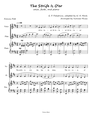 Small Ensemble Flute,Piano,Voice - Level 2 - Digital Download SKU: A0.1015937 Composed by Giovanni Pierluigi da Palestrina. Arranged by Virtuoso Music. Christian,Easter,Praise & Worship,Sacred. Score and parts. 3 pages. Virtuoso Music #5025919. Published by Virtuoso Music (A0.1015937). The Strife is O'er by G. Palestrina (Easter Hymn) re-arranged for Voice, Flute, and PianoEasy/Early Intermediate level.  Easter Dedication. This product was created by a member of ArrangeMe, Hal Leonard's global self-publishing community of independent composers, arrangers, and songwriters. ArrangeMe allows for the publication of unique arrangements of popular titles and original compositions from a variety of voices and backgrounds. The length, difficulty, and retail pricing are determined solely by the discretion of the person who arranged or composed it. About Digital Downloads Digital Downloads are downloadable sheet music files that can be viewed directly on your computer, tablet or mobile device. Once you download your digital sheet music, you can view and print it at home, school, or anywhere you want to make music, and you don’t have to be connected to the internet. Just purchase, download and play! PLEASE NOTE: Your Digital Download will have a watermark at the bottom of each page that will include your name, purchase date and number of copies purchased. You are only authorized to print the number of copies that you have purchased. You may not digitally distribute or print more copies than purchased for use (i.e., you may not print or digitally distribute individual copies to friends or students).
