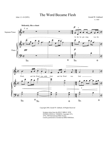 Piano,Vocal,Voice - Level 5 - Digital Download SKU: A0.1012784 Composed by Gerald W. Gabbard. 20th Century,Sacred. Score. 11 pages. Gerald W. Gabbard #5358179. Published by Gerald W. Gabbard (A0.1012784). A modal setting of the famous opening verses of John Chapter 1 for high solo voice (soprano or tenor) and piano. An SATB and piano version is also available. This product was created by a member of ArrangeMe, Hal Leonard’s global self-publishing community of independent composers, arrangers, and songwriters. ArrangeMe allows for the publication of unique arrangements of both popular titles and original compositions from a wide variety of voices and backgrounds. About Digital Downloads Digital Downloads are downloadable sheet music files that can be viewed directly on your computer, tablet or mobile device. Once you download your digital sheet music, you can view and print it at home, school, or anywhere you want to make music, and you don’t have to be connected to the internet. Just purchase, download and play! PLEASE NOTE: Your Digital Download will have a watermark at the bottom of each page that will include your name, purchase date and number of copies purchased. You are only authorized to print the number of copies that you have purchased. You may not digitally distribute or print more copies than purchased for use (i.e., you may not print or digitally distribute individual copies to friends or students).