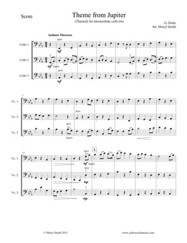 String Ensemble,String Trio Cello - Level 2 - Digital Download SKU: A0.812885 Composed by Gustav Holst. Arranged by Yellow Cello Music. 20th Century. Score and parts. 5 pages. Sheryl Smith #4787041. Published by Sheryl Smith (A0.812885). He beautiful slow theme from Jupiter!All parts are in bass clef.Cello 1 goes up to 4th positionCello 2 goes up to 3rd positionCello 3 goes up to 2nd position. This product was created by a member of ArrangeMe, Hal Leonard’s global self-publishing community of independent composers, arrangers, and songwriters. ArrangeMe allows for the publication of unique arrangements of both popular titles and original compositions from a wide variety of voices and backgrounds. About Digital Downloads Digital Downloads are downloadable sheet music files that can be viewed directly on your computer, tablet or mobile device. Once you download your digital sheet music, you can view and print it at home, school, or anywhere you want to make music, and you don’t have to be connected to the internet. Just purchase, download and play! PLEASE NOTE: Your Digital Download will have a watermark at the bottom of each page that will include your name, purchase date and number of copies purchased. You are only authorized to print the number of copies that you have purchased. You may not digitally distribute or print more copies than purchased for use (i.e., you may not print or digitally distribute individual copies to friends or students).