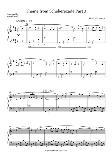 Piano Solo - Level 3 - Digital Download SKU: A0.1223976 Composed by Nikolay Andreyevich Rimsky-Korsakov. Arranged by Martin Neill. 19th Century,Romantic Period. Score. 2 pages. Martin Neill #820092. Published by Martin Neill (A0.1223976). Such a haunting melody! It really only needs the simplest of accompaniments and a touch of pedal, and you’ll sound like a concert pianist!Martin Neill is a professional composer and arranger based in the UK. He has won many international composition competitions, and his music is published by Starshine, Chichester Music Press and others. His arrangements show great attention to detail, including phrasing, dynamics and fingering suggestions, which is why they are popular with tens of thousands of musicians around the globe. This product was created by a member of ArrangeMe, Hal Leonard's global self-publishing community of independent composers, arrangers, and songwriters. ArrangeMe allows for the publication of unique arrangements of popular titles and original compositions from a variety of voices and backgrounds. The length, difficulty, and retail pricing are determined solely by the discretion of the person who arranged or composed it. About Digital Downloads Digital Downloads are downloadable sheet music files that can be viewed directly on your computer, tablet or mobile device. Once you download your digital sheet music, you can view and print it at home, school, or anywhere you want to make music, and you don’t have to be connected to the internet. Just purchase, download and play! PLEASE NOTE: Your Digital Download will have a watermark at the bottom of each page that will include your name, purchase date and number of copies purchased. You are only authorized to print the number of copies that you have purchased. You may not digitally distribute or print more copies than purchased for use (i.e., you may not print or digitally distribute individual copies to friends or students).