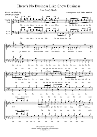 Choral 2-Part Chorus,Choir,Choral - Level 1 - Digital Download SKU: A0.1381279 Composed by Irving Berlin. Arranged by Vicky Jacobs. Broadway,Musical/Show. 3 pages. Vicky Jacobs (Glee Club) #965983. Published by Vicky Jacobs (Glee Club) (A0.1381279). This is a very straight-forward version of this classic song. Perfect as a singalong or quick win with your choir - it's mostly in unison with a tiny bit of easy harmony at the end and still packs a punch! This product was created by a member of ArrangeMe, Hal Leonard’s global self-publishing community of independent composers, arrangers, and songwriters. ArrangeMe allows for the publication of unique arrangements of both popular titles and original compositions from a wide variety of voices and backgrounds. About Digital Downloads Digital Downloads are downloadable sheet music files that can be viewed directly on your computer, tablet or mobile device. Once you download your digital sheet music, you can view and print it at home, school, or anywhere you want to make music, and you don’t have to be connected to the internet. Just purchase, download and play! PLEASE NOTE: Your Digital Download will have a watermark at the bottom of each page that will include your name, purchase date and number of copies purchased. You are only authorized to print the number of copies that you have purchased. You may not digitally distribute or print more copies than purchased for use (i.e., you may not print or digitally distribute individual copies to friends or students).
