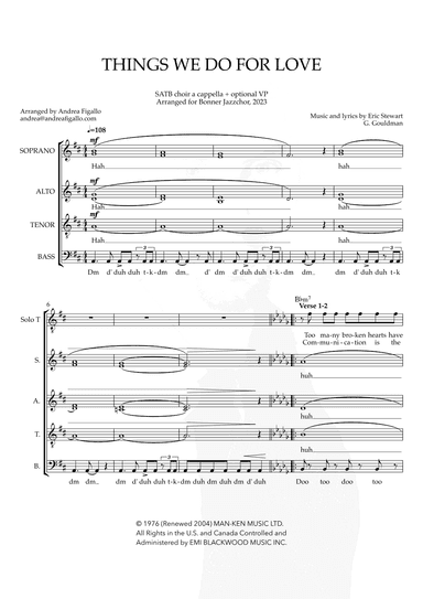 Voice (SSAA) - Level 3 - Digital Download SKU: A0.879546 By 10cc. By Eric Stewart and Graham Gouldman. Arranged by Anders Lindqvist. A Cappella,Barbershop,Contemporary,Pop,Rock. Barbershop Quartet. 4 pages. Anders Lindqvist #3911095. Published by Anders Lindqvist (A0.879546). A close harmony arrangement of the popular hit by Graham Gouldman & Eric Stewart and performed by 10CC. Suitable for a female acapella quartet or chorus of intermediate skills. Also available for male or mixed voices. This product was created by a member of ArrangeMe, Hal Leonard’s global self-publishing community of independent composers, arrangers, and songwriters. ArrangeMe allows for the publication of unique arrangements of both popular titles and original compositions from a wide variety of voices and backgrounds. About Digital Downloads Digital Downloads are downloadable sheet music files that can be viewed directly on your computer, tablet or mobile device. Once you download your digital sheet music, you can view and print it at home, school, or anywhere you want to make music, and you don’t have to be connected to the internet. Just purchase, download and play! PLEASE NOTE: Your Digital Download will have a watermark at the bottom of each page that will include your name, purchase date and number of copies purchased. You are only authorized to print the number of copies that you have purchased. You may not digitally distribute or print more copies than purchased for use (i.e., you may not print or digitally distribute individual copies to friends or students).