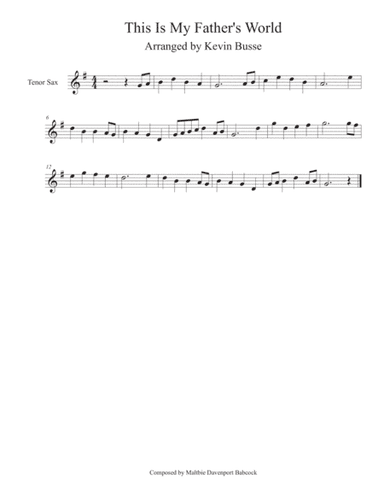 Piano,Tenor Saxophone - Level 5 - Digital Download SKU: A0.786564 Composed by Maltbie D. Babcock, Franklin L. Sheppard. Arranged by Beka Wilson. Celtic,Christian,Gospel,Sacred. Score and part. 8 pages. Beka Wilson #6257197. Published by Beka Wilson (A0.786564). This Celtic-style advanced instrumental solo of "This Is My Father’s World" is perfect for a prelude, offertory, or other special music piece for church. This arrangement is also available as a solo for flute, oboe, clarinet, bassoon, alto sax, F horn, trumpet, trombone, violin, viola, and cello, and as a duet for harp/flute, harp/violin, harp/viola, and harp/cello. A vocal version of this arrangement will be made available soon. Length: approximately 3 minutes Key: Concert D (E for B flat instruments, B for E flat instruments, A for F instruments)8 pages (includes score and separate solo part)Want this arrangement in a different key or for a different set of instruments? Shoot me an email at [email protected] for a custom version of this arrangement that I can post on Sheet Music Plus for you. This product was created by a member of ArrangeMe, Hal Leonard's global self-publishing community of independent composers, arrangers, and songwriters. ArrangeMe allows for the publication of unique arrangements of popular titles and original compositions from a variety of voices and backgrounds. The length, difficulty, and retail pricing are determined solely by the discretion of the person who arranged or composed it. About Digital Downloads Digital Downloads are downloadable sheet music files that can be viewed directly on your computer, tablet or mobile device. Once you download your digital sheet music, you can view and print it at home, school, or anywhere you want to make music, and you don’t have to be connected to the internet. Just purchase, download and play! PLEASE NOTE: Your Digital Download will have a watermark at the bottom of each page that will include your name, purchase date and number of copies purchased. You are only authorized to print the number of copies that you have purchased. You may not digitally distribute or print more copies than purchased for use (i.e., you may not print or digitally distribute individual copies to friends or students).