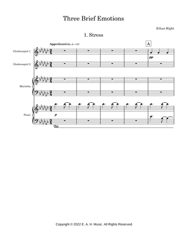 Mixed Percussion,Percussion Ensemble Mallet Percussion - Level 3 - Digital Download SKU: A0.1087799 Composed by Ethan Hight. Contemporary. Score and parts. 17 pages. E. A. H. Music #691453. Published by E. A. H. Music (A0.1087799). Three Brief Emotions is a three-movement sound portrait of the main feelings experienced during the 2020 Covid-19 pandemic scored for percussion quartet. Due to a lack of instruments during the pandemic, this piece was tailored to the instruments that each member of an online Texas Christian University percussion ensemble had at their disposal. Through intricate rhythmic and melodic motifs, the three miniature movements combine to form a unique and uplifting sonic experience for any listener. This product was created by a member of ArrangeMe, Hal Leonard's global self-publishing community of independent composers, arrangers, and songwriters. ArrangeMe allows for the publication of unique arrangements of popular titles and original compositions from a variety of voices and backgrounds. The length, difficulty, and retail pricing are determined solely by the discretion of the person who arranged or composed it. About Digital Downloads Digital Downloads are downloadable sheet music files that can be viewed directly on your computer, tablet or mobile device. Once you download your digital sheet music, you can view and print it at home, school, or anywhere you want to make music, and you don’t have to be connected to the internet. Just purchase, download and play! PLEASE NOTE: Your Digital Download will have a watermark at the bottom of each page that will include your name, purchase date and number of copies purchased. You are only authorized to print the number of copies that you have purchased. You may not digitally distribute or print more copies than purchased for use (i.e., you may not print or digitally distribute individual copies to friends or students).