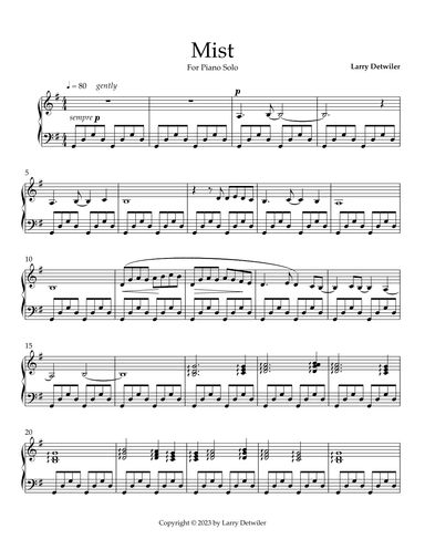 Piano Solo - Level 2 - Digital Download SKU: A0.1317597 By Larry Detwiler. By Larry Detwiler. 20th Century,New Age. Score. 6 pages. Larry Detwiler #906267. Published by Larry Detwiler (A0.1317597). These thre short new age style piano pieces feature easy ostinati and rhythms which will make your beginning piano students sound great. This product was created by a member of ArrangeMe, Hal Leonard’s global self-publishing community of independent composers, arrangers, and songwriters. ArrangeMe allows for the publication of unique arrangements of both popular titles and original compositions from a wide variety of voices and backgrounds. About Digital Downloads Digital Downloads are downloadable sheet music files that can be viewed directly on your computer, tablet or mobile device. Once you download your digital sheet music, you can view and print it at home, school, or anywhere you want to make music, and you don’t have to be connected to the internet. Just purchase, download and play! PLEASE NOTE: Your Digital Download will have a watermark at the bottom of each page that will include your name, purchase date and number of copies purchased. You are only authorized to print the number of copies that you have purchased. You may not digitally distribute or print more copies than purchased for use (i.e., you may not print or digitally distribute individual copies to friends or students).