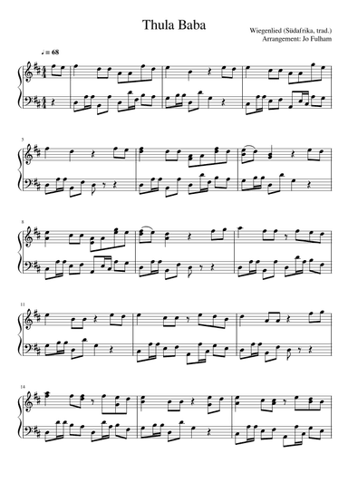 Electronic Keyboard,Instrumental Solo - Level 3 - Digital Download SKU: A0.1049218 Composed by South African Folk Song. Arranged by Jo Fulham. Children,Folk. Individual part. 3 pages. Jo Fulham #653603. Published by Jo Fulham (A0.1049218). A medium-light version for (electronic) keyboard with a keyboard range of at least five octaves. The individual ranges are: - right hand: from E4 to D6 - left hand: from A2 to D4 For the audio file (in split mode without automatic accompaniment) GM-Sound No. 80 "Ocarina" was used for the right hand and GM-Sound No. 13 "Marimba" was used for the left hand. This product was created by a member of ArrangeMe, Hal Leonard's global self-publishing community of independent composers, arrangers, and songwriters. ArrangeMe allows for the publication of unique arrangements of popular titles and original compositions from a variety of voices and backgrounds. The length, difficulty, and retail pricing are determined solely by the discretion of the person who arranged or composed it. About Digital Downloads Digital Downloads are downloadable sheet music files that can be viewed directly on your computer, tablet or mobile device. Once you download your digital sheet music, you can view and print it at home, school, or anywhere you want to make music, and you don’t have to be connected to the internet. Just purchase, download and play! PLEASE NOTE: Your Digital Download will have a watermark at the bottom of each page that will include your name, purchase date and number of copies purchased. You are only authorized to print the number of copies that you have purchased. You may not digitally distribute or print more copies than purchased for use (i.e., you may not print or digitally distribute individual copies to friends or students).