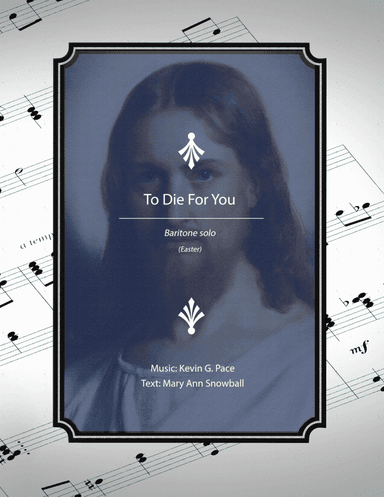 Vocal Solo,Voice - Level 4 - Digital Download SKU: A0.702346 Composed by Kevin G. Pace (ASCAP), Mary Ann Snowball. Christian,Easter,Praise & Worship,Sacred. 6 pages. Kevin G. Pace #6370759. Published by Kevin G. Pace (A0.702346). A sacred vocal solo written for baritone voice. Music composed by Kevin G. Pace. Text by Mary Ann Snowball. She text below:To die for you- That is why I came to earth-To die for you. The sole reason for my birth,So you could view my omniscient love displayed,That I could prove your great worth, your precious name.I came for you; In mortality I bled.I came for you. All alone I moaned and pled-And prayed for you. In the Garden, on the crossI died for you. This became my saving cause-To make you new. So you could be free of sin,I would be true. Through my love so you could win,I died for you. To the earth I came and knew I’d die for you; I was born to die for you. This product was created by a member of ArrangeMe, Hal Leonard's global self-publishing community of independent composers, arrangers, and songwriters. ArrangeMe allows for the publication of unique arrangements of popular titles and original compositions from a variety of voices and backgrounds. The length, difficulty, and retail pricing are determined solely by the discretion of the person who arranged or composed it. About Digital Downloads Digital Downloads are downloadable sheet music files that can be viewed directly on your computer, tablet or mobile device. Once you download your digital sheet music, you can view and print it at home, school, or anywhere you want to make music, and you don’t have to be connected to the internet. Just purchase, download and play! PLEASE NOTE: Your Digital Download will have a watermark at the bottom of each page that will include your name, purchase date and number of copies purchased. You are only authorized to print the number of copies that you have purchased. You may not digitally distribute or print more copies than purchased for use (i.e., you may not print or digitally distribute individual copies to friends or students).