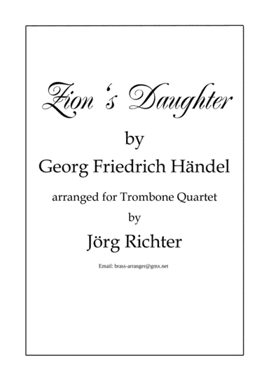 Brass Ensemble,Trombone Quartet - Level 4 - Digital Download SKU: A0.798619 Composed by George Frideric Handel. Arranged by Jörg Richter. Baroque,Christmas,Praise & Worship. Score and parts. 7 pages. Jörg Richter #4411811. Published by Jörg Richter (A0.798619). Eine Bearbeitung des bekannten Adventsliedes "Tochter Zion, freue dich" nach Chören aus Georg Friedrich Händels Oratorien "Joshua" und "Judas Maccabäus" für Posaunenquartett. This product was created by a member of ArrangeMe, Hal Leonard’s global self-publishing community of independent composers, arrangers, and songwriters. ArrangeMe allows for the publication of unique arrangements of both popular titles and original compositions from a wide variety of voices and backgrounds. About Digital Downloads Digital Downloads are downloadable sheet music files that can be viewed directly on your computer, tablet or mobile device. Once you download your digital sheet music, you can view and print it at home, school, or anywhere you want to make music, and you don’t have to be connected to the internet. Just purchase, download and play! PLEASE NOTE: Your Digital Download will have a watermark at the bottom of each page that will include your name, purchase date and number of copies purchased. You are only authorized to print the number of copies that you have purchased. You may not digitally distribute or print more copies than purchased for use (i.e., you may not print or digitally distribute individual copies to friends or students).