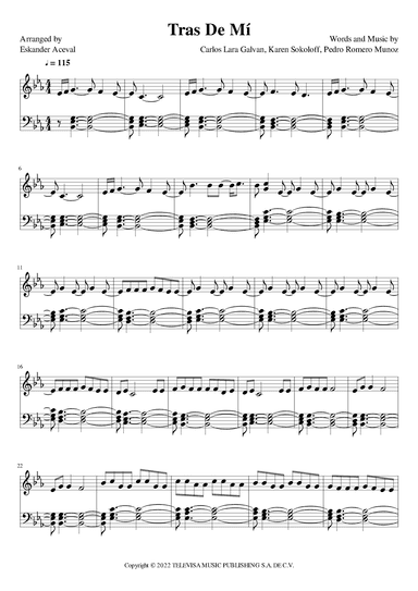 Piano Solo - Level 2 - Digital Download SKU: A0.1213890 Composed by Carlos Lara Galvan, Karen Sokoloff, and Pedro Romero Munoz. Arranged by Eskander Aceval. Film/TV,Latin,Pop. Score. 3 pages. Eskander Aceval #811088. Published by Eskander Aceval (A0.1213890). RBD - Tras de Mi acordes (chords), piano. Original key/tonalidad & tempo. *It does NOT include the lyrics. This product was created by a member of ArrangeMe, Hal Leonard’s global self-publishing community of independent composers, arrangers, and songwriters. ArrangeMe allows for the publication of unique arrangements of both popular titles and original compositions from a wide variety of voices and backgrounds. About Digital Downloads Digital Downloads are downloadable sheet music files that can be viewed directly on your computer, tablet or mobile device. Once you download your digital sheet music, you can view and print it at home, school, or anywhere you want to make music, and you don’t have to be connected to the internet. Just purchase, download and play! PLEASE NOTE: Your Digital Download will have a watermark at the bottom of each page that will include your name, purchase date and number of copies purchased. You are only authorized to print the number of copies that you have purchased. You may not digitally distribute or print more copies than purchased for use (i.e., you may not print or digitally distribute individual copies to friends or students).