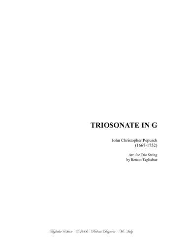 String Ensemble,String Trio - Digital Download SKU: A0.724637 Composed by Pepusch, Johann Christoph. Arranged by Renato Tagliabue. Baroque. Score and parts. 25 pages. Renato Tagliabue #4727055. Published by Renato Tagliabue (A0.724637). This product was created by a member of ArrangeMe, Hal Leonard's global self-publishing community of independent composers, arrangers, and songwriters. ArrangeMe allows for the publication of unique arrangements of popular titles and original compositions from a variety of voices and backgrounds. The length, difficulty, and retail pricing are determined solely by the discretion of the person who arranged or composed it. About Digital Downloads Digital Downloads are downloadable sheet music files that can be viewed directly on your computer, tablet or mobile device. Once you download your digital sheet music, you can view and print it at home, school, or anywhere you want to make music, and you don’t have to be connected to the internet. Just purchase, download and play! PLEASE NOTE: Your Digital Download will have a watermark at the bottom of each page that will include your name, purchase date and number of copies purchased. You are only authorized to print the number of copies that you have purchased. You may not digitally distribute or print more copies than purchased for use (i.e., you may not print or digitally distribute individual copies to friends or students).