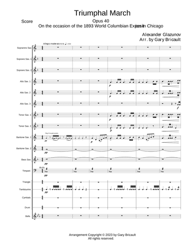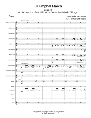 Clarinet Ensemble,Woodwind Ensemble Bass Clarinet,Bassethorn,Contra Alto Clarinet,E-Flat Clarinet - Level 5 - Digital Download SKU: A0.1314101 Composed by Alexander Glaxunov. Arranged by Gary Bricault. Romantic Period. 98 pages. Gary Bricault #902834. Published by Gary Bricault (A0.1314101). Arrangement for Clarinet Choir (Eb Sop 4 Bb 2 BH 2 Bs Cl Ca Cb + Timp + Perc). Performance time 8'58".On the occasion of the 1893 World Columbian Exposition in Chicago. This product was created by a member of ArrangeMe, Hal Leonard’s global self-publishing community of independent composers, arrangers, and songwriters. ArrangeMe allows for the publication of unique arrangements of both popular titles and original compositions from a wide variety of voices and backgrounds. About Digital Downloads Digital Downloads are downloadable sheet music files that can be viewed directly on your computer, tablet or mobile device. Once you download your digital sheet music, you can view and print it at home, school, or anywhere you want to make music, and you don’t have to be connected to the internet. Just purchase, download and play! PLEASE NOTE: Your Digital Download will have a watermark at the bottom of each page that will include your name, purchase date and number of copies purchased. You are only authorized to print the number of copies that you have purchased. You may not digitally distribute or print more copies than purchased for use (i.e., you may not print or digitally distribute individual copies to friends or students).