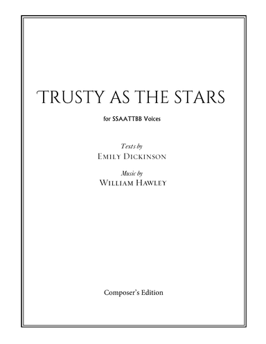 Choral Choir,Choral (SATB divisi) - Level 4 - Digital Download SKU: A0.1346770 Composed by Hawley, William. Classical,Contemporary. 6 pages. William Hawley #931553. Published by William Hawley (A0.1346770). This is the score of William Hawley's "Trusty as The Stars", for SSAATTBB Voices, on texts by Emily Dickinson, with Piano Reduction for rehearsal. The Audio Sample is the complete Composer's Demo recording. Performance duration: 1.5 minutes. ASCAP https://williamhawley.net. This product was created by a member of ArrangeMe, Hal Leonard’s global self-publishing community of independent composers, arrangers, and songwriters. ArrangeMe allows for the publication of unique arrangements of both popular titles and original compositions from a wide variety of voices and backgrounds. About Digital Downloads Digital Downloads are downloadable sheet music files that can be viewed directly on your computer, tablet or mobile device. Once you download your digital sheet music, you can view and print it at home, school, or anywhere you want to make music, and you don’t have to be connected to the internet. Just purchase, download and play! PLEASE NOTE: Your Digital Download will have a watermark at the bottom of each page that will include your name, purchase date and number of copies purchased. You are only authorized to print the number of copies that you have purchased. You may not digitally distribute or print more copies than purchased for use (i.e., you may not print or digitally distribute individual copies to friends or students).