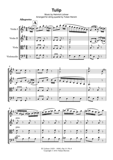 String Quartet String Quartet - Level 3 - Digital Download SKU: A0.815510 Composed by Heinrich Lichner. Arranged by Thomas Strauch. Classical,Folk,Romantic Period,Traditional,Wedding. Score and parts. 13 pages. Purple Pedagogy Publishing #4775777. Published by Purple Pedagogy Publishing (A0.815510). This is the Op. 111, No. 4 for piano solo, often played by advanced students. I have arranged it for string quartet. It is a delightful work, slightly difficult, but a nice range for all parts. Great for wedding prelude or reception or as a quick encore piece. Melody is high enough to be heard easily outdoors. This product was created by a member of ArrangeMe, Hal Leonard's global self-publishing community of independent composers, arrangers, and songwriters. ArrangeMe allows for the publication of unique arrangements of popular titles and original compositions from a variety of voices and backgrounds. The length, difficulty, and retail pricing are determined solely by the discretion of the person who arranged or composed it. About Digital Downloads Digital Downloads are downloadable sheet music files that can be viewed directly on your computer, tablet or mobile device. Once you download your digital sheet music, you can view and print it at home, school, or anywhere you want to make music, and you don’t have to be connected to the internet. Just purchase, download and play! PLEASE NOTE: Your Digital Download will have a watermark at the bottom of each page that will include your name, purchase date and number of copies purchased. You are only authorized to print the number of copies that you have purchased. You may not digitally distribute or print more copies than purchased for use (i.e., you may not print or digitally distribute individual copies to friends or students).