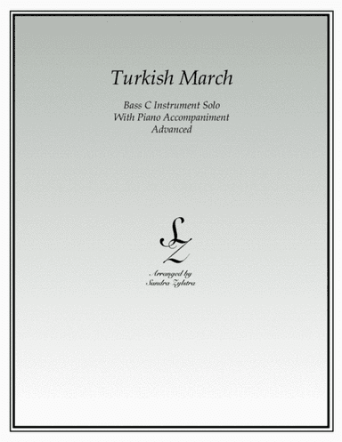 Small Ensemble Bass Clef Instrument,Cello,Euphonium,Instrumental Solo,Piano,Tuba - Level 5 - Digital Download SKU: A0.711930 Composed by Wolfgang Amadeus Mozart. Arranged by Sandra Zylstra. Classical,Contest,Festival,Standards. Score and individual part. 8 pages. Sandra dee zylstra #20573. Published by sandra dee zylstra (A0.711930). "Alla Turca" is part of Sonata in A, K 331 by Mozart. Enjoy playing this lively arrangement as an early advanced bass C instrument solo with piano accompaniment and a separate instrument part! (Approximately 4 minutes, 7 pages) You can look at other arrangements by Sandra Zylstra on Sheet Music Plus: https://www.sheetmusicplus.com/formats/singles/sandra-zylstra/600092+3001855 and at Piano Pronto: Composers Community https://pianopronto.com/composers-community/sandra-zylstra/ . This product was created by a member of ArrangeMe, Hal Leonard’s global self-publishing community of independent composers, arrangers, and songwriters. ArrangeMe allows for the publication of unique arrangements of both popular titles and original compositions from a wide variety of voices and backgrounds. About Digital Downloads Digital Downloads are downloadable sheet music files that can be viewed directly on your computer, tablet or mobile device. Once you download your digital sheet music, you can view and print it at home, school, or anywhere you want to make music, and you don’t have to be connected to the internet. Just purchase, download and play! PLEASE NOTE: Your Digital Download will have a watermark at the bottom of each page that will include your name, purchase date and number of copies purchased. You are only authorized to print the number of copies that you have purchased. You may not digitally distribute or print more copies than purchased for use (i.e., you may not print or digitally distribute individual copies to friends or students).