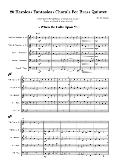 Brass Ensemble - Digital Download SKU: A0.955712 Composed by BlechMax. Contemporary. Score and parts. 140 pages. Markus Dag #6373275. Published by Markus Dag (A0.955712). 20 Heroics / Chorals / Fantasies for Brass QuintetThese are short pieces of music for a ton of occasions. This product was created by a member of ArrangeMe, Hal Leonard’s global self-publishing community of independent composers, arrangers, and songwriters. ArrangeMe allows for the publication of unique arrangements of both popular titles and original compositions from a wide variety of voices and backgrounds. About Digital Downloads Digital Downloads are downloadable sheet music files that can be viewed directly on your computer, tablet or mobile device. Once you download your digital sheet music, you can view and print it at home, school, or anywhere you want to make music, and you don’t have to be connected to the internet. Just purchase, download and play! PLEASE NOTE: Your Digital Download will have a watermark at the bottom of each page that will include your name, purchase date and number of copies purchased. You are only authorized to print the number of copies that you have purchased. You may not digitally distribute or print more copies than purchased for use (i.e., you may not print or digitally distribute individual copies to friends or students).