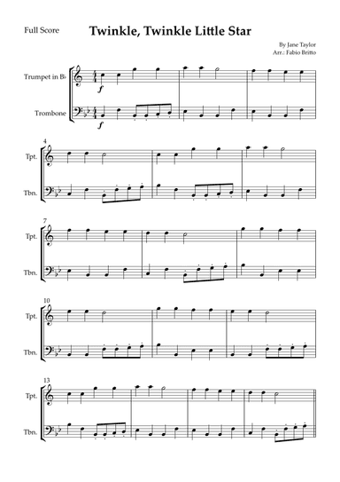 Trumpet Duet Trumpet - Level 1 - Digital Download SKU: A0.1089294 Composed by Jane Taylor. Arranged by Fabio Britto. Children,Folk,Instructional,Traditional. Score. 4 pages. Minhas Partituras #693491. Published by Minhas Partituras (A0.1089294). Arrangement of the song Twinkle, Twinkle Little Star for Trumpet in Bb Duo. This product was created by a member of ArrangeMe, Hal Leonard’s global self-publishing community of independent composers, arrangers, and songwriters. ArrangeMe allows for the publication of unique arrangements of both popular titles and original compositions from a wide variety of voices and backgrounds. About Digital Downloads Digital Downloads are downloadable sheet music files that can be viewed directly on your computer, tablet or mobile device. Once you download your digital sheet music, you can view and print it at home, school, or anywhere you want to make music, and you don’t have to be connected to the internet. Just purchase, download and play! PLEASE NOTE: Your Digital Download will have a watermark at the bottom of each page that will include your name, purchase date and number of copies purchased. You are only authorized to print the number of copies that you have purchased. You may not digitally distribute or print more copies than purchased for use (i.e., you may not print or digitally distribute individual copies to friends or students).