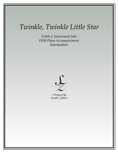 Small Ensemble C Instrument,Instrumental Solo,Piano,Piccolo,Treble Clef Instrument - Level 3 - Digital Download SKU: A0.711964 Composed by Traditional. Arranged by Sandra Zylstra. Children,Contest,Festival,Folk,Instructional. Score and individual part. 8 pages. Sandra dee zylstra #38121. Published by sandra dee zylstra (A0.711964). A fun way to play a theme and variation of a traditional classic! Twinkle, Twinkle Little Star is arranged as an intermediate treble C instrument solo with piano accompaniment and a separate instrument part. (Approximately 4 minutes, 7 pages) You can look at other arrangements by Sandra Zylstra on Sheet Music Plus: https://www.sheetmusicplus.com/formats/singles/sandra-zylstra/600092+3001855 and at Piano Pronto: Composers Community https://pianopronto.com/composers-community/sandra-zylstra/ . This product was created by a member of ArrangeMe, Hal Leonard’s global self-publishing community of independent composers, arrangers, and songwriters. ArrangeMe allows for the publication of unique arrangements of both popular titles and original compositions from a wide variety of voices and backgrounds. About Digital Downloads Digital Downloads are downloadable sheet music files that can be viewed directly on your computer, tablet or mobile device. Once you download your digital sheet music, you can view and print it at home, school, or anywhere you want to make music, and you don’t have to be connected to the internet. Just purchase, download and play! PLEASE NOTE: Your Digital Download will have a watermark at the bottom of each page that will include your name, purchase date and number of copies purchased. You are only authorized to print the number of copies that you have purchased. You may not digitally distribute or print more copies than purchased for use (i.e., you may not print or digitally distribute individual copies to friends or students).