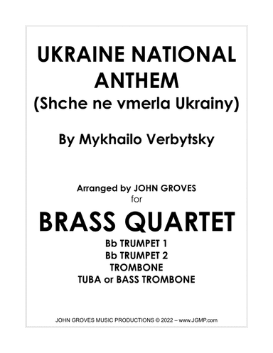 Brass Ensemble,Trombone Quartet Euphonium,Trombone,Tuba - Level 3 - Digital Download SKU: A0.784213 Composed by Mykhailo Verbytsky. Arranged by John Groves. Multicultural,Romantic Period,World. Score and parts. 7 pages. John Groves #6865117. Published by John Groves (A0.784213). Ukraine National Anthem - arranged for Trombone QuartetScore and Parts included:3 Trombones1 Bass Trombone or TubaPerform as a quartet or double up parts for trombone choir configurations. This product was created by a member of ArrangeMe, Hal Leonard’s global self-publishing community of independent composers, arrangers, and songwriters. ArrangeMe allows for the publication of unique arrangements of both popular titles and original compositions from a wide variety of voices and backgrounds. About Digital Downloads Digital Downloads are downloadable sheet music files that can be viewed directly on your computer, tablet or mobile device. Once you download your digital sheet music, you can view and print it at home, school, or anywhere you want to make music, and you don’t have to be connected to the internet. Just purchase, download and play! PLEASE NOTE: Your Digital Download will have a watermark at the bottom of each page that will include your name, purchase date and number of copies purchased. You are only authorized to print the number of copies that you have purchased. You may not digitally distribute or print more copies than purchased for use (i.e., you may not print or digitally distribute individual copies to friends or students).