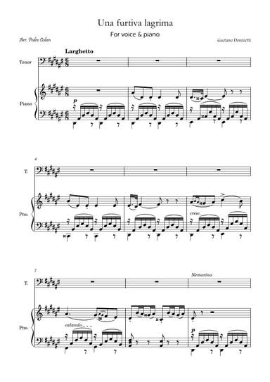 Guitar,Piano,Vocal,Voice - Level 3 - Digital Download SKU: A0.1176555 Composed by Gaetano Donizetti. Arranged by Pedro Cohen. Classical,Opera,Romantic Period. Score. 8 pages. Pedro Cohen #776627. Published by Pedro Cohen (A0.1176555). This is an arrangement for the aria "Una Furtiva Lagrima" from the opera L'elisir d'amore. This version is in the key of D#m for Tenor, with chords. This product was created by a member of ArrangeMe, Hal Leonard’s global self-publishing community of independent composers, arrangers, and songwriters. ArrangeMe allows for the publication of unique arrangements of both popular titles and original compositions from a wide variety of voices and backgrounds. About Digital Downloads Digital Downloads are downloadable sheet music files that can be viewed directly on your computer, tablet or mobile device. Once you download your digital sheet music, you can view and print it at home, school, or anywhere you want to make music, and you don’t have to be connected to the internet. Just purchase, download and play! PLEASE NOTE: Your Digital Download will have a watermark at the bottom of each page that will include your name, purchase date and number of copies purchased. You are only authorized to print the number of copies that you have purchased. You may not digitally distribute or print more copies than purchased for use (i.e., you may not print or digitally distribute individual copies to friends or students).