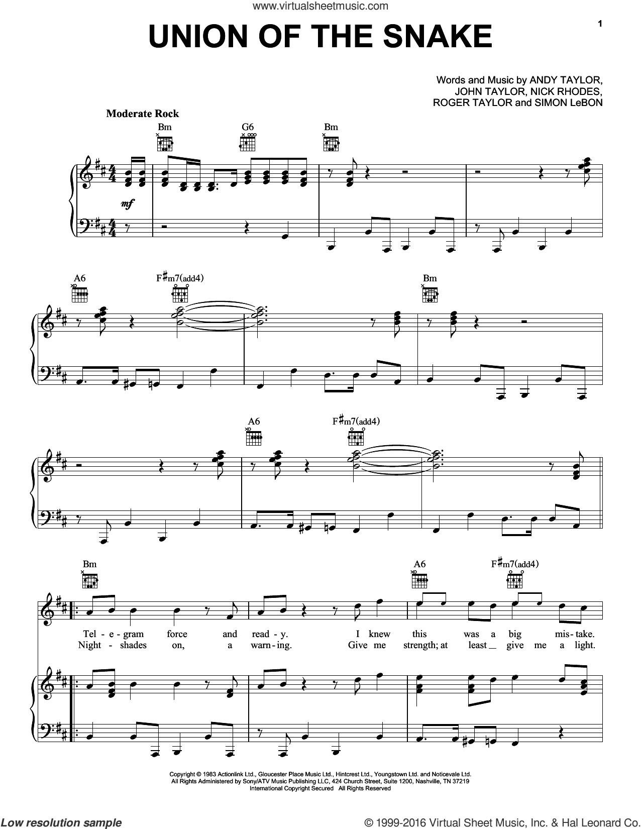 Digital sheet music for voice, piano or guitarNOTE: chords, lead sheet indications and lyrics may be included (please, check the first page above before to buy this item to see what's included)Publisher: Hal LeonardContributors to this music title:Andrew Taylor (writer)John Taylor (writer)Nick Rhodes (writer)Roger Taylor (writer)Simon LeBon (writer)This item includes: PDF (digital sheet music to download and print), Interactive Sheet Music (for online playback, transposition and printing). You can transpose this music in any key.Instrumentation:voice, piano or guitarSkill Level:intermediateGenre:popPages:6