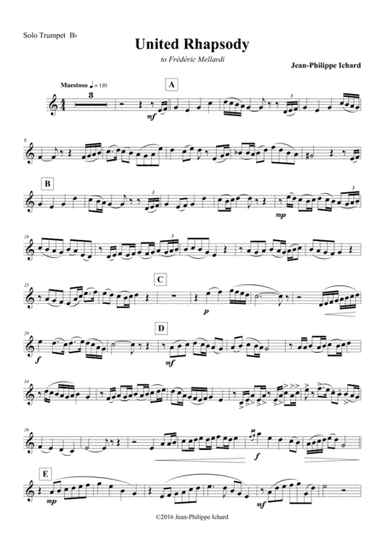 Brass Ensemble Trumpet - Level 5 - Digital Download SKU: A0.905030 Composed by Jean-Philippe Ichard. Contemporary. Score and parts. 34 pages. Jean-Philippe Ichard #3879777. Published by Jean-Philippe Ichard (A0.905030). "United Rhapsody" is a piece for Solo Trumpet and Brass Quintet dedicated to French Solist Frédéric Mellardi.Duration 5:37 min Official website - https://www.jeanphilippeichard.com@SACEM This product was created by a member of ArrangeMe, Hal Leonard’s global self-publishing community of independent composers, arrangers, and songwriters. ArrangeMe allows for the publication of unique arrangements of both popular titles and original compositions from a wide variety of voices and backgrounds. About Digital Downloads Digital Downloads are downloadable sheet music files that can be viewed directly on your computer, tablet or mobile device. Once you download your digital sheet music, you can view and print it at home, school, or anywhere you want to make music, and you don’t have to be connected to the internet. Just purchase, download and play! PLEASE NOTE: Your Digital Download will have a watermark at the bottom of each page that will include your name, purchase date and number of copies purchased. You are only authorized to print the number of copies that you have purchased. You may not digitally distribute or print more copies than purchased for use (i.e., you may not print or digitally distribute individual copies to friends or students).