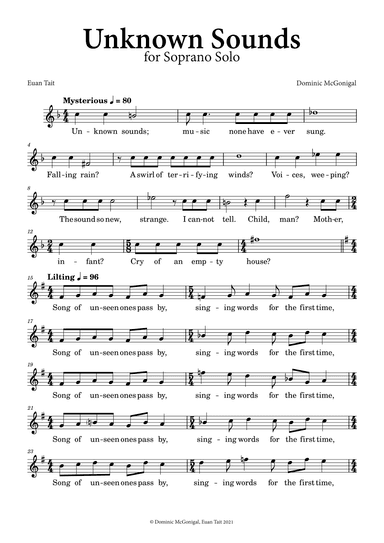 Instrumental Solo,Soprano voice - Level 3 - Digital Download SKU: A0.1348766 By Janet Oates. By Dominic McGonigal. 21st Century,Classical,Contemporary. Individual part. 3 pages. C8 Music #933537. Published by C8 Music (A0.1348766). Written for soprano and composer, Janet Oates, Unknown Sounds reflects on the beauty and mystery of the music not yet heard. Searching for the unknown sounds, the singer creates beauty in the melodic lines, overlaid to bring in tonal depth and harmonic movement. This is one of a series of pieces for sopranos (solo and ensemble). Scored for Soprano Solo. 3'30". More at www.dominicmcgonigal.com. This product was created by a member of ArrangeMe, Hal Leonard's global self-publishing community of independent composers, arrangers, and songwriters. ArrangeMe allows for the publication of unique arrangements of popular titles and original compositions from a variety of voices and backgrounds. The length, difficulty, and retail pricing are determined solely by the discretion of the person who arranged or composed it. About Digital Downloads Digital Downloads are downloadable sheet music files that can be viewed directly on your computer, tablet or mobile device. Once you download your digital sheet music, you can view and print it at home, school, or anywhere you want to make music, and you don’t have to be connected to the internet. Just purchase, download and play! PLEASE NOTE: Your Digital Download will have a watermark at the bottom of each page that will include your name, purchase date and number of copies purchased. You are only authorized to print the number of copies that you have purchased. You may not digitally distribute or print more copies than purchased for use (i.e., you may not print or digitally distribute individual copies to friends or students).