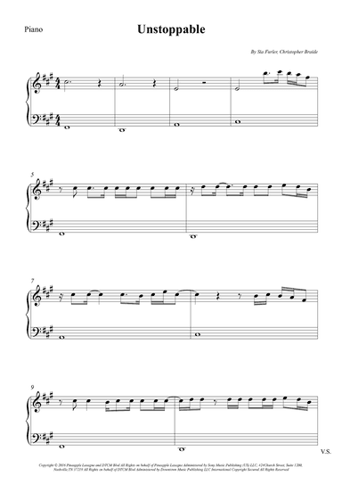 Digital sheet music for voice, piano or guitarNOTE: chords, lead sheet indications and lyrics may be included (please, check the first page above before to buy this item to see what's included)Publisher: Hal LeonardContributors to this music title:Chris Braide (writer)Sia Furler (writer)This item includes: PDF (digital sheet music to download and print), Interactive Sheet Music (for online playback, transposition and printing). You can transpose this music in any key.Instrumentation:voice, piano or guitarSkill Level:intermediateGenre:popPages:6