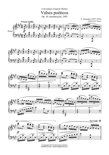 Piano Solo - Level 4 - Digital Download SKU: A0.532354 Composed by Enrique Granados. Arranged by Klas Krantz. Romantic Period. Score. 2 pages. Amadeus Music #6049621. Published by Amadeus Music (A0.532354). Enrique Granados (1867–1916) was a Spanish pianist and composer of classical music. His music is in a uniquely Spanish style and, as such, representative of musical nationalism. Granados wrote piano music, chamber music, songs, zarzuelas, and an orchestral tone poem based on Dante’s Divine Comedy. Many of his piano compositions have been transcribed for the classical guitar and are generally considered as some of the most beautiful music in the guitar repertoire: examples include Danza No. 5 and Goyescas. This product was created by a member of ArrangeMe, Hal Leonard's global self-publishing community of independent composers, arrangers, and songwriters. ArrangeMe allows for the publication of unique arrangements of popular titles and original compositions from a variety of voices and backgrounds. The length, difficulty, and retail pricing are determined solely by the discretion of the person who arranged or composed it. About Digital Downloads Digital Downloads are downloadable sheet music files that can be viewed directly on your computer, tablet or mobile device. Once you download your digital sheet music, you can view and print it at home, school, or anywhere you want to make music, and you don’t have to be connected to the internet. Just purchase, download and play! PLEASE NOTE: Your Digital Download will have a watermark at the bottom of each page that will include your name, purchase date and number of copies purchased. You are only authorized to print the number of copies that you have purchased. You may not digitally distribute or print more copies than purchased for use (i.e., you may not print or digitally distribute individual copies to friends or students).