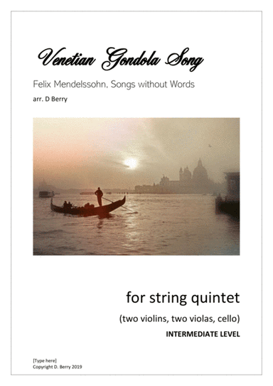 String Ensemble,String Quintet - Level 3 - Digital Download SKU: A0.995331 Composed by Felix Bartholdy Mendelssohn. Arranged by D. Berry. Contemporary. Score and parts. 12 pages. D. Berry #4812101. Published by D. Berry (A0.995331). String arrangement of Venetian Gondola Song in G Minor from Mendelssohn's Songs without Words, originally for piano. This arrangement comes with alternate parts so that it can be played by an ensemble of either 2 violins, 2 violas and 1 cello, or 2 violins, 1 viola, and 2 cellos. . This product was created by a member of ArrangeMe, Hal Leonard's global self-publishing community of independent composers, arrangers, and songwriters. ArrangeMe allows for the publication of unique arrangements of popular titles and original compositions from a variety of voices and backgrounds. The length, difficulty, and retail pricing are determined solely by the discretion of the person who arranged or composed it. About Digital Downloads Digital Downloads are downloadable sheet music files that can be viewed directly on your computer, tablet or mobile device. Once you download your digital sheet music, you can view and print it at home, school, or anywhere you want to make music, and you don’t have to be connected to the internet. Just purchase, download and play! PLEASE NOTE: Your Digital Download will have a watermark at the bottom of each page that will include your name, purchase date and number of copies purchased. You are only authorized to print the number of copies that you have purchased. You may not digitally distribute or print more copies than purchased for use (i.e., you may not print or digitally distribute individual copies to friends or students).
