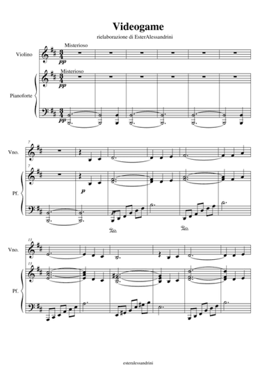 Piano,Violin - Level 2 - Digital Download SKU: A0.758136 Composed by Anonimo. Arranged by Ester Alessandrini. Children,Instructional,World. 10 pages. Ester #2030957. Published by ester (A0.758136). musica di un videogioco rielaborata e variata per violino e pianoforte This product was created by a member of ArrangeMe, Hal Leonard's global self-publishing community of independent composers, arrangers, and songwriters. ArrangeMe allows for the publication of unique arrangements of popular titles and original compositions from a variety of voices and backgrounds. The length, difficulty, and retail pricing are determined solely by the discretion of the person who arranged or composed it. About Digital Downloads Digital Downloads are downloadable sheet music files that can be viewed directly on your computer, tablet or mobile device. Once you download your digital sheet music, you can view and print it at home, school, or anywhere you want to make music, and you don’t have to be connected to the internet. Just purchase, download and play! PLEASE NOTE: Your Digital Download will have a watermark at the bottom of each page that will include your name, purchase date and number of copies purchased. You are only authorized to print the number of copies that you have purchased. You may not digitally distribute or print more copies than purchased for use (i.e., you may not print or digitally distribute individual copies to friends or students).