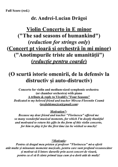 String Orchestra - Level 5 - Digital Download SKU: A0.1313054 By Andrei Lucian Dragoi. By Andrei Lucian Dragoi. Arranged by Andrei Lucian Dragoi. Classical,Contemporary,Contest,Festival. 385 pages. Andrei-Lucian M. Drăgoi #901891. Published by Andrei-Lucian M. Drăgoi (A0.1313054). This is a strings-only reduction of my "Violin Concerto in E minor" ("Concert pentru vioară și orchestra in mi minor") (“The Sad Seasons of Humankind”/”Anotimpurile triste ale umanității”) (E minor[160bpm] - A minor[100bpm] - D minor[100bpm] - E minor[140 bpm])" which is entirely composed by me and integrally interpreted by Note Performer 3 (the only Artificial Intelligence-based playback engine for musical notation worldwide).Have a nice, inspired audition! FOR AUDIO SEE THE 1ST PIECE FROM MY SONGTRADR PROFILE PAGE: https://www.songtradr.com/user/profile/dragoiAlbum on YouTube: https://www.youtube.com/playlist?list=OLAK5uy_mjnDEAiYsXiei4syYMd2xf3P_8ZbGnfyc. This product was created by a member of ArrangeMe, Hal Leonard’s global self-publishing community of independent composers, arrangers, and songwriters. ArrangeMe allows for the publication of unique arrangements of both popular titles and original compositions from a wide variety of voices and backgrounds. About Digital Downloads Digital Downloads are downloadable sheet music files that can be viewed directly on your computer, tablet or mobile device. Once you download your digital sheet music, you can view and print it at home, school, or anywhere you want to make music, and you don’t have to be connected to the internet. Just purchase, download and play! PLEASE NOTE: Your Digital Download will have a watermark at the bottom of each page that will include your name, purchase date and number of copies purchased. You are only authorized to print the number of copies that you have purchased. You may not digitally distribute or print more copies than purchased for use (i.e., you may not print or digitally distribute individual copies to friends or students).