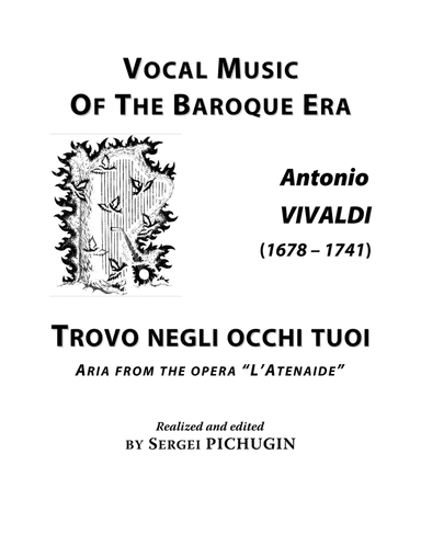 Piano,Vocal,Voice - Level 4 - Digital Download SKU: A0.868835 Composed by Antonio VIVALDI (1678 – 1741). Arranged by Sergei PICHUGIN. Baroque,Concert,Instructional,Opera,Standards. Score. 5 pages. Really Good Music, LLC. #4610139. Published by Really Good Music, LLC. (A0.868835). "Trovo negli occhi tuoi" is an aria from the opera "L'Atenaide", composed in 1728 by Antonio VIVALDI (1678 – 1741). It has been realized from the manuscript of the opera and arranged by Sergei Pichugin for voice and piano. The aria may be an invaluable addition to the repertoire of vocal teachers and students. It is available in the original key of G minor (D4 – Eb5) for low voice. This product was created by a member of ArrangeMe, Hal Leonard's global self-publishing community of independent composers, arrangers, and songwriters. ArrangeMe allows for the publication of unique arrangements of popular titles and original compositions from a variety of voices and backgrounds. The length, difficulty, and retail pricing are determined solely by the discretion of the person who arranged or composed it. About Digital Downloads Digital Downloads are downloadable sheet music files that can be viewed directly on your computer, tablet or mobile device. Once you download your digital sheet music, you can view and print it at home, school, or anywhere you want to make music, and you don’t have to be connected to the internet. Just purchase, download and play! PLEASE NOTE: Your Digital Download will have a watermark at the bottom of each page that will include your name, purchase date and number of copies purchased. You are only authorized to print the number of copies that you have purchased. You may not digitally distribute or print more copies than purchased for use (i.e., you may not print or digitally distribute individual copies to friends or students).