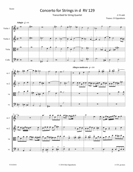 Vivaldi: Concerto for Strings in d RV 129; Movements 1, 2 and 3. Arranged for String Quartet (arr. D Oppenheim)