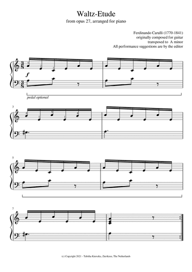Piano Solo - Level 2 - Digital Download SKU: A0.901007 Composed by Ferdinando Carulli (1770-1841). Arranged by Tabitha Kierszka. Classical,Concert,Instructional,Standards. Score. 4 pages. Tabitha Kierszka #6448425. Published by Tabitha Kierszka (A0.901007). Waltz-Etude is a fast and brilliant classical study, originally composed for guitar, in a virtuoso sounding arrangement for easy piano. It has been transposed to the key of A minor. . This product was created by a member of ArrangeMe, Hal Leonard’s global self-publishing community of independent composers, arrangers, and songwriters. ArrangeMe allows for the publication of unique arrangements of both popular titles and original compositions from a wide variety of voices and backgrounds. About Digital Downloads Digital Downloads are downloadable sheet music files that can be viewed directly on your computer, tablet or mobile device. Once you download your digital sheet music, you can view and print it at home, school, or anywhere you want to make music, and you don’t have to be connected to the internet. Just purchase, download and play! PLEASE NOTE: Your Digital Download will have a watermark at the bottom of each page that will include your name, purchase date and number of copies purchased. You are only authorized to print the number of copies that you have purchased. You may not digitally distribute or print more copies than purchased for use (i.e., you may not print or digitally distribute individual copies to friends or students).