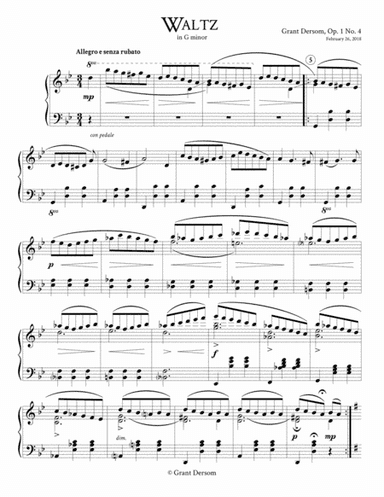 Piano Solo - Level 5 - Digital Download SKU: A0.1016499 Composed by Grant Dersom. Classical,Contemporary,Romantic Period. Score. 4 pages. Sonive Publishing #6167109. Published by Sonive Publishing (A0.1016499). This waltz is the fourth in Dersom's collection of 24 Waltzes in every major and minor key. One of the collection's more challenging waltzes, No. 4 features some intriguing chromaticism as well as some rather extreme counterpoint. This product was created by a member of ArrangeMe, Hal Leonard’s global self-publishing community of independent composers, arrangers, and songwriters. ArrangeMe allows for the publication of unique arrangements of both popular titles and original compositions from a wide variety of voices and backgrounds. About Digital Downloads Digital Downloads are downloadable sheet music files that can be viewed directly on your computer, tablet or mobile device. Once you download your digital sheet music, you can view and print it at home, school, or anywhere you want to make music, and you don’t have to be connected to the internet. Just purchase, download and play! PLEASE NOTE: Your Digital Download will have a watermark at the bottom of each page that will include your name, purchase date and number of copies purchased. You are only authorized to print the number of copies that you have purchased. You may not digitally distribute or print more copies than purchased for use (i.e., you may not print or digitally distribute individual copies to friends or students).