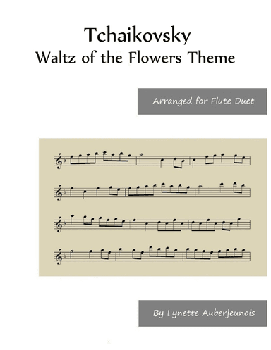 Flute Duet Flute - Level 2 - Digital Download SKU: A0.1286555 Composed by Peter Ilyich Tchaikovsky. Arranged by Lynette Auberjeunois. Chamber,Classical,Contest,Festival,Wedding. Score. 5 pages. Flute Files Publishing #877616. Published by Flute Files Publishing (A0.1286555). "Waltz of the Flowers Theme" flute duet sheet music from The Nutcracker. Composed by Peter I. Tchaikovsky. Arranged by Lynette Auberjeunois for late beginner/early intermediate level. Digital download includes a two page flute duet score in the key of Eb. Range: Flute 1: Ab1 - Eb3, Flute 2: F1 - Eb2. Published by Flute Files Publishing (CL62-1129). This product was created by a member of ArrangeMe, Hal Leonard's global self-publishing community of independent composers, arrangers, and songwriters. ArrangeMe allows for the publication of unique arrangements of popular titles and original compositions from a variety of voices and backgrounds. The length, difficulty, and retail pricing are determined solely by the discretion of the person who arranged or composed it. About Digital Downloads Digital Downloads are downloadable sheet music files that can be viewed directly on your computer, tablet or mobile device. Once you download your digital sheet music, you can view and print it at home, school, or anywhere you want to make music, and you don’t have to be connected to the internet. Just purchase, download and play! PLEASE NOTE: Your Digital Download will have a watermark at the bottom of each page that will include your name, purchase date and number of copies purchased. You are only authorized to print the number of copies that you have purchased. You may not digitally distribute or print more copies than purchased for use (i.e., you may not print or digitally distribute individual copies to friends or students).