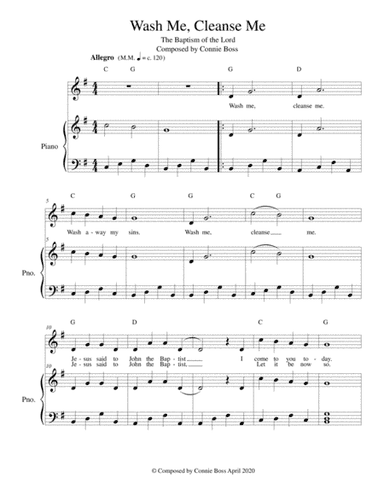 Guitar,Piano,Vocal,Voice - Level 1 - Digital Download SKU: A0.801411 Composed by Connie Boss. Children,Instructional,Sacred. Score. 3 pages. Connie Boss #5362885. Published by Connie Boss (A0.801411). This song is about the Baptism of Jesus by John the Baptist. It is perfect for kids or anyone. It is for solo and easy piano. See lyrics below: Wash Me, Cleanse Me. (The Baptism of Jesus) By Connie Boss Refrain: Wash me, cleanse me Wash away my sins Wash me, cleanse me Verse 1: Jesus said to John the Baptist I come to you today Let us walk into the river Please wash my sins away But John was really puzzled He said how can this be? My Lord how am I worthy? Maybe you should baptize me. Refrain: Verse 2: Jesus said to John the Baptist "Let it be now so" After John had baptized Jesus From the Heavens came a glow The Heavens opened up Then from up above The spirit of God Descended like a Dove Refrain: This product was created by a member of ArrangeMe, Hal Leonard’s global self-publishing community of independent composers, arrangers, and songwriters. ArrangeMe allows for the publication of unique arrangements of both popular titles and original compositions from a wide variety of voices and backgrounds. About Digital Downloads Digital Downloads are downloadable sheet music files that can be viewed directly on your computer, tablet or mobile device. Once you download your digital sheet music, you can view and print it at home, school, or anywhere you want to make music, and you don’t have to be connected to the internet. Just purchase, download and play! PLEASE NOTE: Your Digital Download will have a watermark at the bottom of each page that will include your name, purchase date and number of copies purchased. You are only authorized to print the number of copies that you have purchased. You may not digitally distribute or print more copies than purchased for use (i.e., you may not print or digitally distribute individual copies to friends or students).