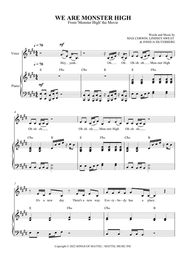 Guitar,Piano,Vocal,Voice - Level 3 - Digital Download SKU: A0.1319828 Composed by Joshua Silverberg, Lindsey Sweat, and Max Corwin. Arranged by SCMusic. Broadway,Children,Film/TV,Halloween,Musical/Show,Pop. Score. 6 pages. SCMusic #908385. Published by SCMusic (A0.1319828). 'We Are Monster High' from the Nickelodeon and Paramount+ movie 'Monster High', arranged for voice and piano with guitar chords, in the original key. This product was created by a member of ArrangeMe, Hal Leonard’s global self-publishing community of independent composers, arrangers, and songwriters. ArrangeMe allows for the publication of unique arrangements of both popular titles and original compositions from a wide variety of voices and backgrounds. About Digital Downloads Digital Downloads are downloadable sheet music files that can be viewed directly on your computer, tablet or mobile device. Once you download your digital sheet music, you can view and print it at home, school, or anywhere you want to make music, and you don’t have to be connected to the internet. Just purchase, download and play! PLEASE NOTE: Your Digital Download will have a watermark at the bottom of each page that will include your name, purchase date and number of copies purchased. You are only authorized to print the number of copies that you have purchased. You may not digitally distribute or print more copies than purchased for use (i.e., you may not print or digitally distribute individual copies to friends or students).