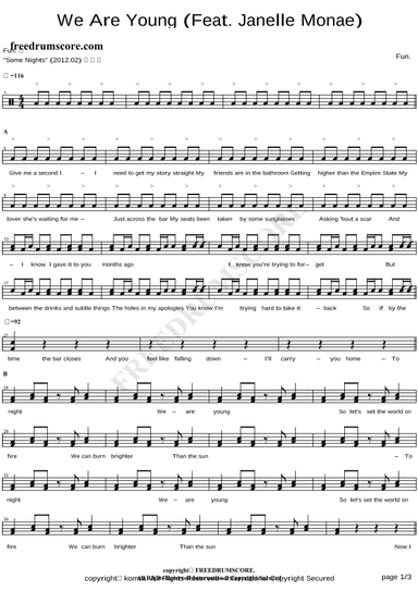 Drum Set,Drums - Level 3 - Digital Download SKU: A0.1161959 By fun. By Andrew Dost, Jack Michael Antonoff, Jeffrey Bhasker, and Nathaniel Ruess. Arranged by COPYDRUM. Pop. Score. 3 pages. COPYDRUM #762330. Published by COPYDRUM (A0.1161959). This product was created by a member of ArrangeMe, Hal Leonard’s global self-publishing community of independent composers, arrangers, and songwriters. ArrangeMe allows for the publication of unique arrangements of both popular titles and original compositions from a wide variety of voices and backgrounds. About Digital Downloads Digital Downloads are downloadable sheet music files that can be viewed directly on your computer, tablet or mobile device. Once you download your digital sheet music, you can view and print it at home, school, or anywhere you want to make music, and you don’t have to be connected to the internet. Just purchase, download and play! PLEASE NOTE: Your Digital Download will have a watermark at the bottom of each page that will include your name, purchase date and number of copies purchased. You are only authorized to print the number of copies that you have purchased. You may not digitally distribute or print more copies than purchased for use (i.e., you may not print or digitally distribute individual copies to friends or students).