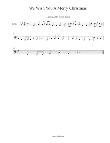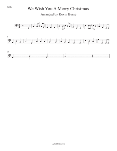 Cello Solo - Level 2 - Digital Download SKU: A0.694827 Composed by Traditional. Arranged by B. C. Dockery. Christian,Christmas,Concert,Sacred. Individual part. 1 pages. Ben Dockery #6505965. Published by Ben Dockery (A0.694827). Arranged for solo cello. Great for lessons, recitals, church services, caroling, and Christmas parties. This product was created by a member of ArrangeMe, Hal Leonard's global self-publishing community of independent composers, arrangers, and songwriters. ArrangeMe allows for the publication of unique arrangements of popular titles and original compositions from a variety of voices and backgrounds. The length, difficulty, and retail pricing are determined solely by the discretion of the person who arranged or composed it. About Digital Downloads Digital Downloads are downloadable sheet music files that can be viewed directly on your computer, tablet or mobile device. Once you download your digital sheet music, you can view and print it at home, school, or anywhere you want to make music, and you don’t have to be connected to the internet. Just purchase, download and play! PLEASE NOTE: Your Digital Download will have a watermark at the bottom of each page that will include your name, purchase date and number of copies purchased. You are only authorized to print the number of copies that you have purchased. You may not digitally distribute or print more copies than purchased for use (i.e., you may not print or digitally distribute individual copies to friends or students).