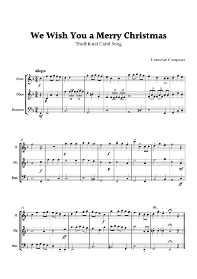 Woodwind Ensemble,Woodwind Quartet Oboe - Level 2 - Digital Download SKU: A0.1320872 Composed by Unknown. Arranged by Rika K. Chamber,Christian,Christmas,Holiday,Traditional. 5 pages. Rika K. #909310. Published by Rika K. (A0.1320872). We present to you an exclusive arrangement of the classic Christmas song, We Wish You a Merry Christmas. This is a traditional English Christmas song that dates back to the 16th century Victorian era. This arrangement has been meticulously wrote for Oboe Quartet with Chords, making it a perfect choice for beginner ensembles. The simplicity and beauty of this piece will allow novice musicians to shine, captivating the audience with the joy of Christmas. Moreover, this arrangement is not just a musical piece, but also an excellent educational resource. Music teachers can use it as teaching material in their classes, helping students to hone their musical skills while preparing for the festive season. Ideal for recitals, concerts, or performances, this arrangement of We Wish You a Merry Christmas will certainly add a festive touch to any event. By purchasing this sheet music, you will be bringing the joy and tradition of Christmas to your music. Don’t miss the opportunity to acquire this exclusive arrangement and bring the magic of Christmas to your music. This product was created by a member of ArrangeMe, Hal Leonard's global self-publishing community of independent composers, arrangers, and songwriters. ArrangeMe allows for the publication of unique arrangements of popular titles and original compositions from a variety of voices and backgrounds. The length, difficulty, and retail pricing are determined solely by the discretion of the person who arranged or composed it. About Digital Downloads Digital Downloads are downloadable sheet music files that can be viewed directly on your computer, tablet or mobile device. Once you download your digital sheet music, you can view and print it at home, school, or anywhere you want to make music, and you don’t have to be connected to the internet. Just purchase, download and play! PLEASE NOTE: Your Digital Download will have a watermark at the bottom of each page that will include your name, purchase date and number of copies purchased. You are only authorized to print the number of copies that you have purchased. You may not digitally distribute or print more copies than purchased for use (i.e., you may not print or digitally distribute individual copies to friends or students).