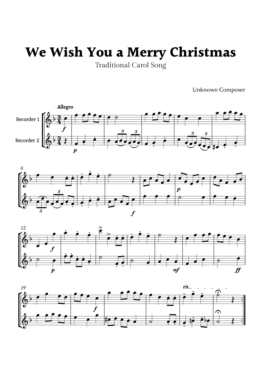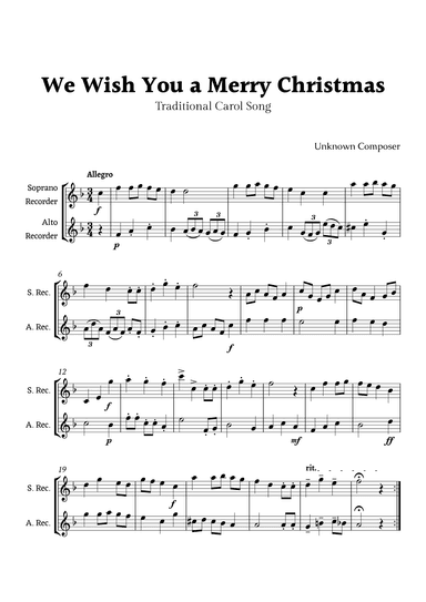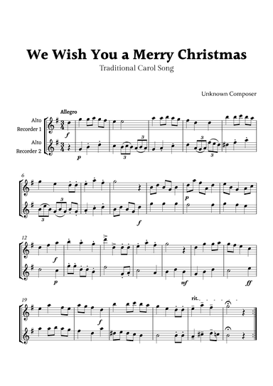 We Wish you a Merry Christmas for Recorder Duet (arr. Rika K.)