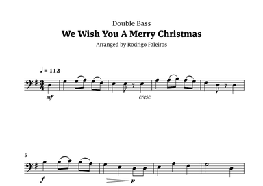 Double Bass,String Bass Solo - Level 2 - Digital Download SKU: A0.1287935 Composed by Anonymous. Arranged by Rodrigo Faleiros. Christmas,Holiday,Standards,Traditional. Individual part. 1 pages. Rodrigo Faleiros #878783. Published by Rodrigo Faleiros (A0.1287935). Enjoy the holidays and christmas spirit with this easy double bass sheet music of WE WISH YOU A MERRY CHRISTMAS.This classic christmas carol is arranged for a solo double bass, written in an easy-to-follow score notated along with chords, ready to please everyone with its warmful melody. This product was created by a member of ArrangeMe, Hal Leonard’s global self-publishing community of independent composers, arrangers, and songwriters. ArrangeMe allows for the publication of unique arrangements of both popular titles and original compositions from a wide variety of voices and backgrounds. About Digital Downloads Digital Downloads are downloadable sheet music files that can be viewed directly on your computer, tablet or mobile device. Once you download your digital sheet music, you can view and print it at home, school, or anywhere you want to make music, and you don’t have to be connected to the internet. Just purchase, download and play! PLEASE NOTE: Your Digital Download will have a watermark at the bottom of each page that will include your name, purchase date and number of copies purchased. You are only authorized to print the number of copies that you have purchased. You may not digitally distribute or print more copies than purchased for use (i.e., you may not print or digitally distribute individual copies to friends or students).