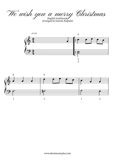 Piano Solo - Level 2 - Digital Download SKU: A0.877181 Composed by Traditional. Arranged by Ioannis Kalpakis. 20th Century,Baroque,Children,Christmas,Holiday. Score. 2 pages. Ioannis Kalpakis #6639247. Published by Ioannis Kalpakis (A0.877181). "We Wish You a Merry Christmas" is a traditional English Christmas carol, listed as numbers 230 and 9681 in the Roud Folk Song Index. The famous version of the carol is from the English West Country.It has been simplified to an intermediate level of difficulty for piano. In the key of C. Easy to play on the white keys of the piano. For students who would like to take advantage of internet technology, lessons are now available over the internet via Skype.  Contact: [email protected] id: mathimata This product was created by a member of ArrangeMe, Hal Leonard’s global self-publishing community of independent composers, arrangers, and songwriters. ArrangeMe allows for the publication of unique arrangements of both popular titles and original compositions from a wide variety of voices and backgrounds. About Digital Downloads Digital Downloads are downloadable sheet music files that can be viewed directly on your computer, tablet or mobile device. Once you download your digital sheet music, you can view and print it at home, school, or anywhere you want to make music, and you don’t have to be connected to the internet. Just purchase, download and play! PLEASE NOTE: Your Digital Download will have a watermark at the bottom of each page that will include your name, purchase date and number of copies purchased. You are only authorized to print the number of copies that you have purchased. You may not digitally distribute or print more copies than purchased for use (i.e., you may not print or digitally distribute individual copies to friends or students).